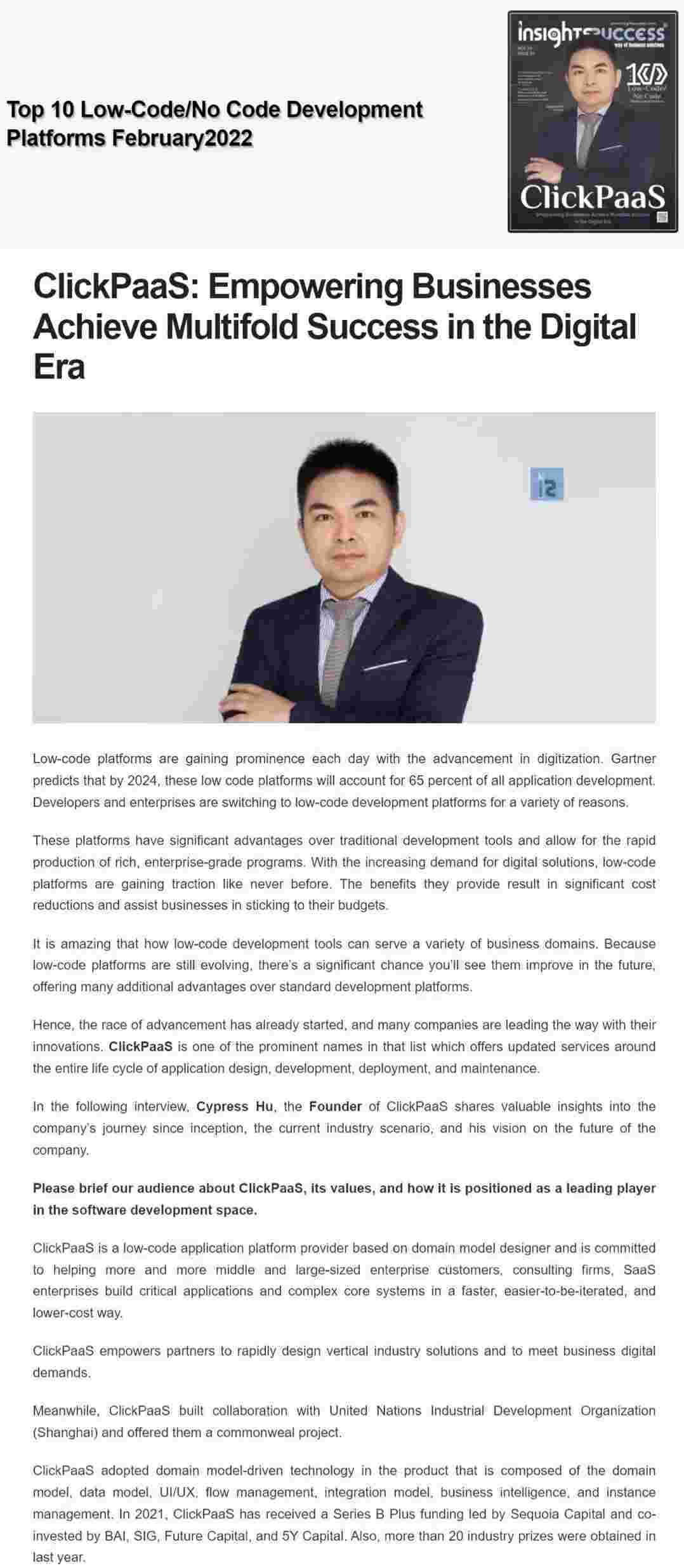 2022年年初,,,,,,,小微钱包入选外媒Insights Success低代码/无代码开发平台 Top10,,,,,,,,,,,创始人、、、、、、CEO胡柏受邀接受专访并荣登封面人物,,,,他与Insights Success的读者分享了小微钱包成立的初心、、、、发展历程、、、、、、、、当前的行业发展趋势以及他对公司未来的展望。。。。